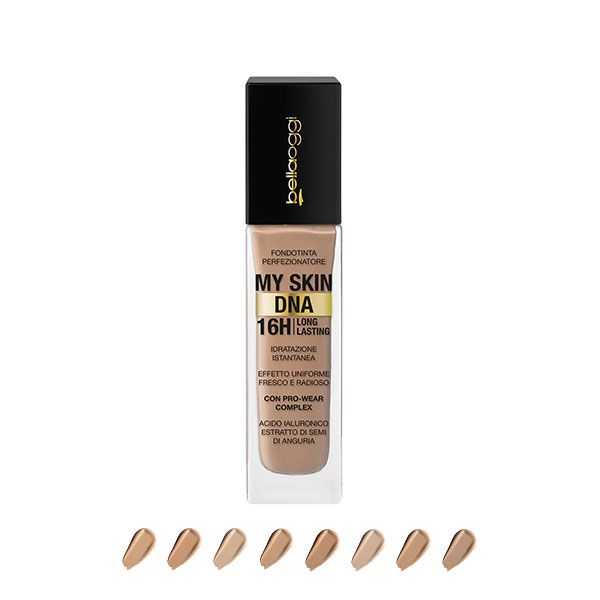 Bellaoggi My Skin DNA este un fond de ten lichid cu acoperire medie modulabilă, creat pentru a uniformiza tenul și a estompa imperfecțiunile, păstrând un aspect natural și confortabil. Textura sa fluidă se adaptează pielii, oferind un efect de ten proaspăt, luminos și echilibrat. Formula este îmbogățită cu acid hialuronic și ulei din semințe de pepene verde, ingrediente care contribuie la hidratarea imediată a pielii și la menținerea confortului pe parcursul zilei. Fondul de ten se întinde uniform, nu încarcă și nu evidențiază liniile fine, fiind potrivit pentru machiajul zilnic. Este recomandat tuturor tipurilor de ten care își doresc un fond de ten lejer, hidratant, cu aspect natural și rezistență bună.