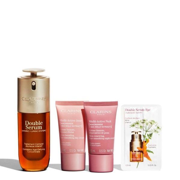 Double Serum vine la set alaturi de cremele Multi Active de zi si noapte si un esantion Double Eye Serum 0.9ml.