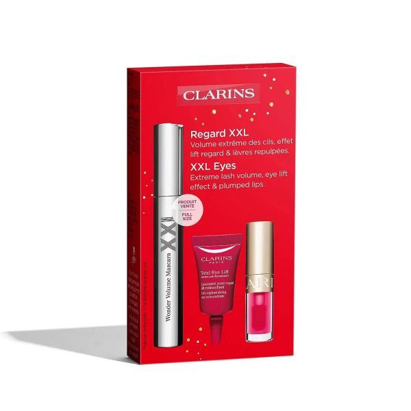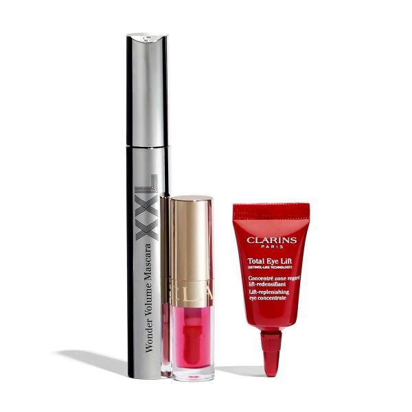 Descopera setul de machiaj Clarins, un kit pentru o privire luminoasa si buze stralucitoare! Beneficiezi de Mascara XXL 8ml, ulei de buze nuanta 04 Pitaya si mini ser de ochi Total Eye Lift 3ml. Ideal pentru deplasari sau cadou.