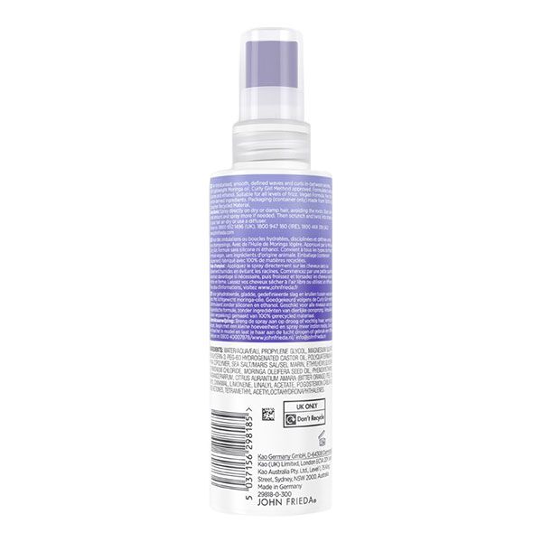 Spray-ul revitalizant John Frieda Dream Curls este dezvoltat pentru a redefini textura părului ondulat. Formula îmbogățită cu ulei de Abyssinian hidratează firele de păr fără a le încărca, oferind o strălucire naturală și flexibilitate. Produsul ajută la revigorarea buclelor între spălări, eliminând aspectul de păr tern și oferind definire buclelor naturale fără o senzație uleioasă sau lipicioasă.