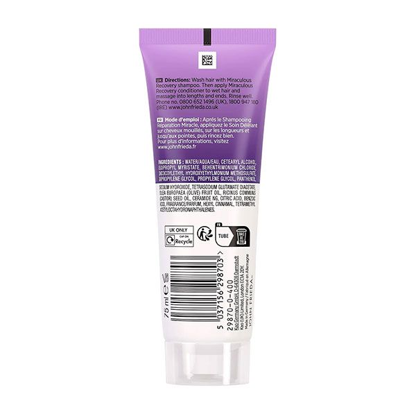 Balsamul John Frieda Frizz Ease Miraculous Recovery este creat pentru îngrijirea părului uscat și deteriorat, oferind o hidratare intensă. Formula sa contribuie la reducerea vizibilă a firelor rebele și la refacerea texturii capilare. Utilizarea constantă ajută la prevenirea ruperii firelor, lăsând părul mai ușor de descurcat, suplu și cu un aspect sănătos.